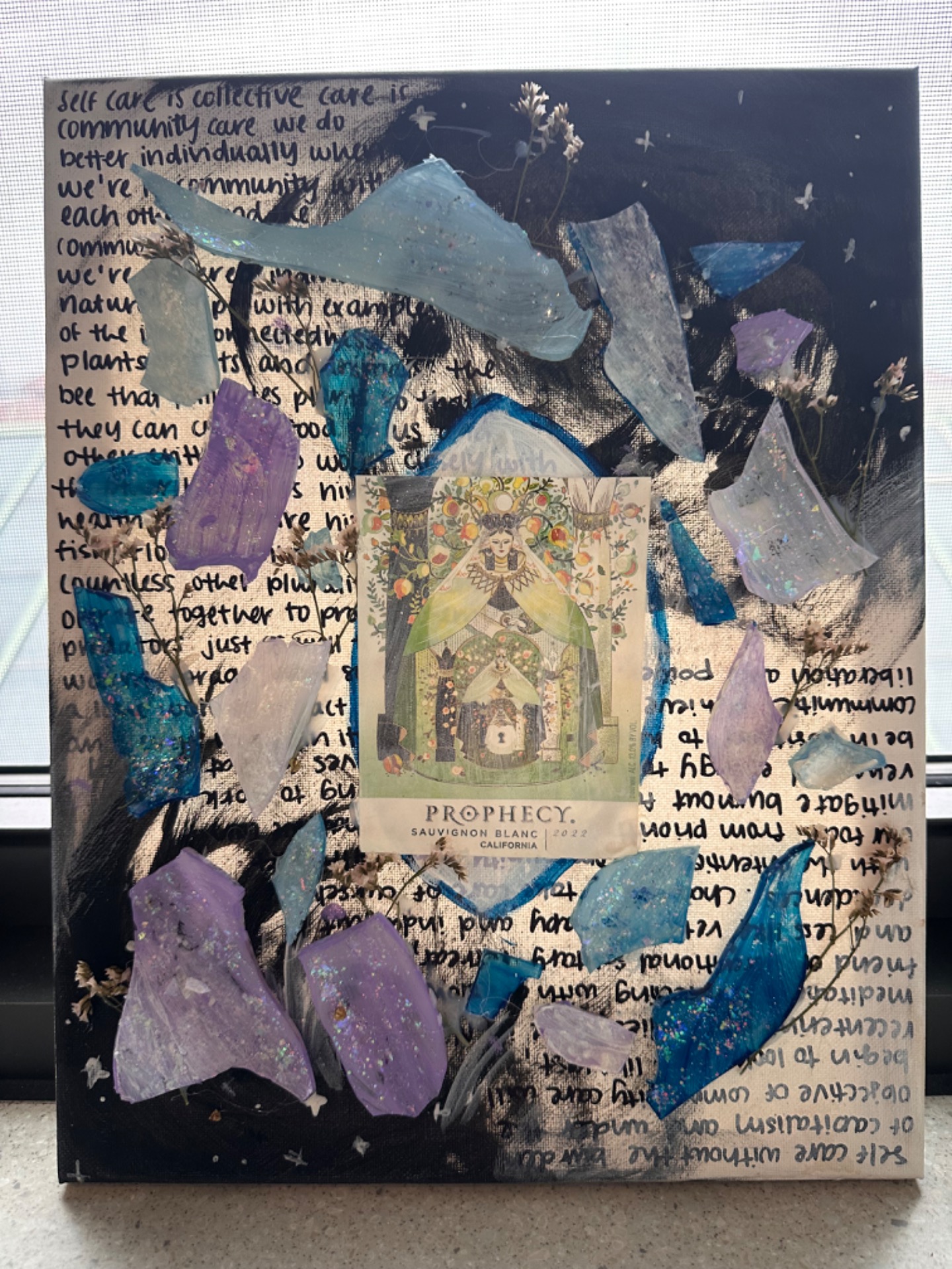 My Dreams into Action piece, titled Prophecy, is a personal reflection. The mixed-media portrayal demonstrates my dream for breaking the cyclical nature of addiction within my family, and for radical eradication of generationally traumatic effects. I believe in the Prophecy of life, and proliferation for all currently experiencing or being affected by addiction. Formatting my research into an artistic expression allowed me to address suppressed childhood memories, while accepting and representing them in a positive way. Prophecy is a piece of self-expression and self-acceptance from a raw state— indicated through rigid shards of glass. I chose a broken bottle to represent the fragility of isolation. I had experienced so much solitude, depression, and anxiety while I isolated myself and gave into addiction that I felt entirely anew when I reached out for support. I began by painting a void of black, wherein desolation finds one in addiction. Solitude is represented by thick, swirling black clouds. My father's battle against alcoholism has set a fire within me to uplift, change, and disrupt the cycle. Passages and salient phrases from Nicole Nimri's "Self Care is Collective Care is Community Care," line the background of Prophecy, commend the strength of community and dismantling the eclipsed love for lone heroes. Inspiring me to look inward, the phrase "Until our cups runneth over into a spring that nourishes us and creates fertile ground to cultivate the fruits of our future" from Nimri's teachings cultivated realizations that I had been falling into the patterns expressed by my own father. However, Prophecy emphasizes growth in nature and growth in self. Nimri insists "Our bodies know that we must rely on one another," interconnecting human relation with nourishment of the soul. In my own experience, reconnection with the community finally saved me from the depths of addiction. Although fragile, the glass shards create a mosaic of promise and creation. There is hope in addiction, and it can be made into something beautiful. Carmen Gonzalez's guest lecture similarly emphasized the importance of reconnecting with nature and family through the course of addiction. In nature we find solace and connection with Earth, emmenating the purest form of sobriety. Intimate, dainty floral appendages sprout from the shards to indicate perseverance. In creating Prophecy, I have committed to rediscovering myself and my community.