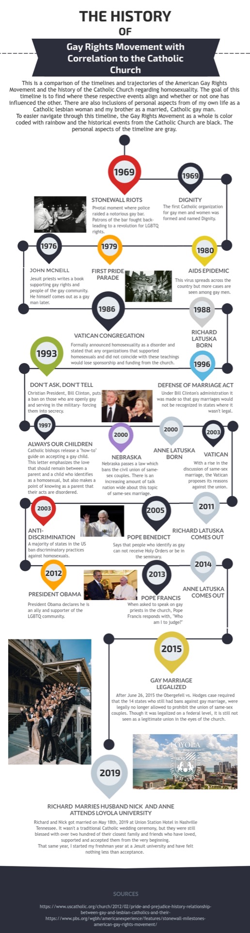 The purpose of this project is to create a visual timeline that covers 3 different aspects of history: The Gay Rights Movement, the relationship the Catholic church has shared with homosexuality, and the personal lives of me and my brother Richard. This timeline begins with arguably the most monumental aspect of the Gay Rights Movement- the Stonewall riots. There are years' worth of fights for equality and events that occurred in the Catholic church regarding homosexuality prior to this date. For the sake of creating a clear and concise presentation of information, this is the event that begins the timeline as a whole.