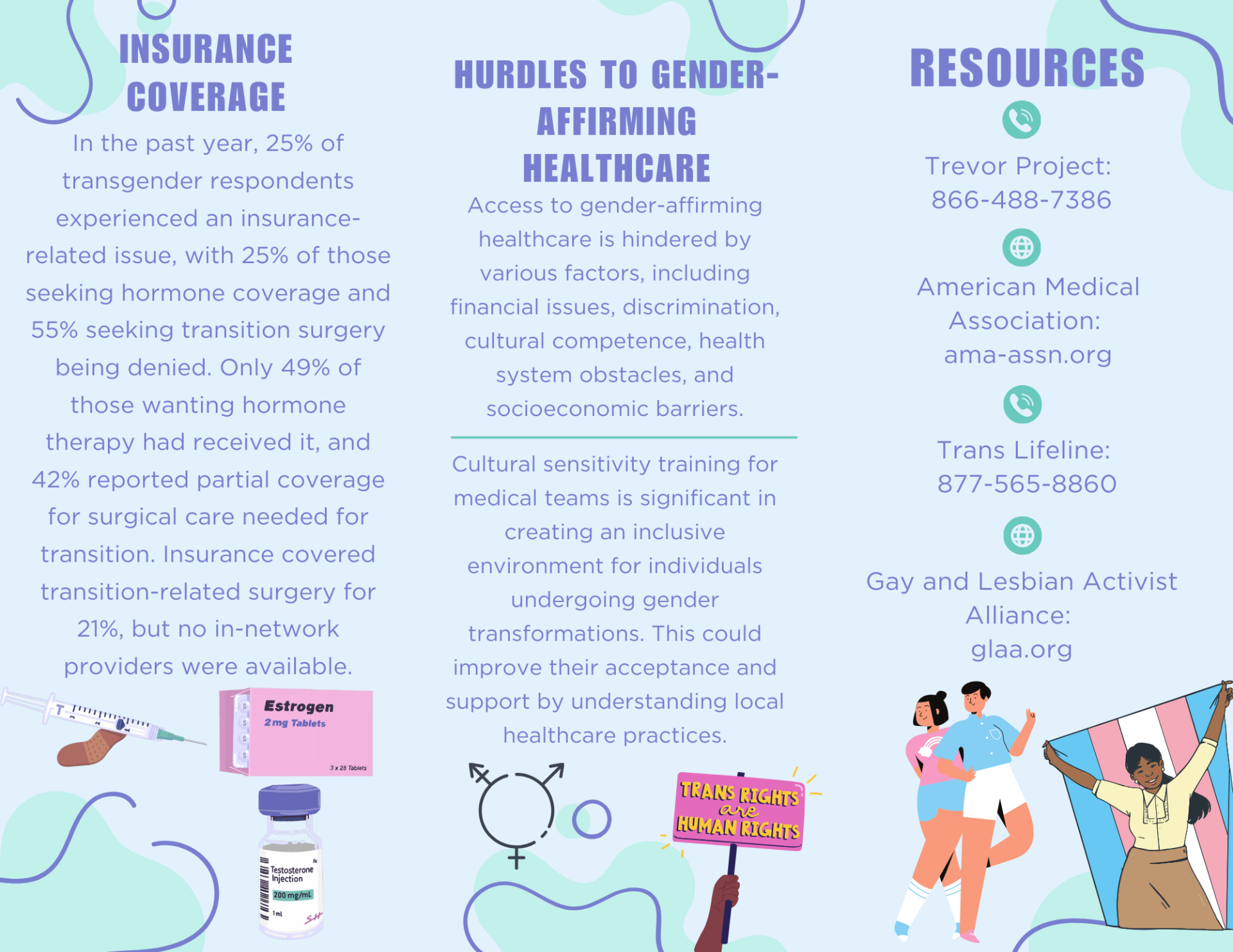 I chose to promote this topic with a pamphlet so that it can reach as many people as possible. This topic can be spread to many people through social media and along with just passing around handouts of it. By reaching more people, it will promote awareness and change for those impacted by this topic. I would share these pamphlets with activist organizations that align with my topic to help promote this change and awareness. With this, my hopes would be to make as many people as possible aware of the disparities that occur daily for people undergoing gender transformations and promote changes within healthcare systems and even the government. In light of my research, I think that those undergoing gender transformations are experiencing disparities everyday and this insight should change the way that other's advocate for this topic.
